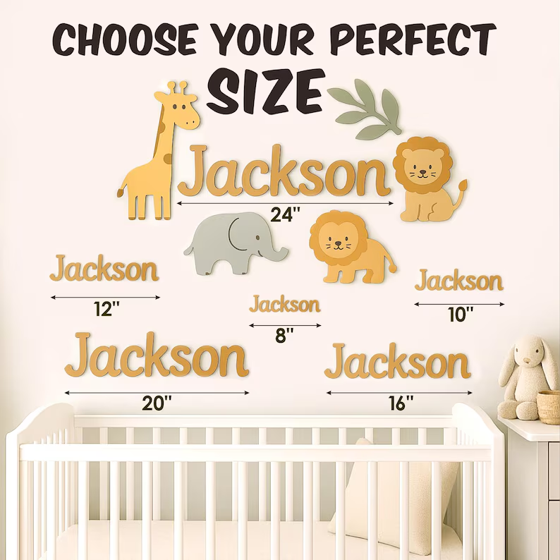 This custom name plaque fits beautifully in safari, jungle, woodland, and neutral nursery themes. Available in multiple size options to suit your space and comes ready to hang for easy installation.