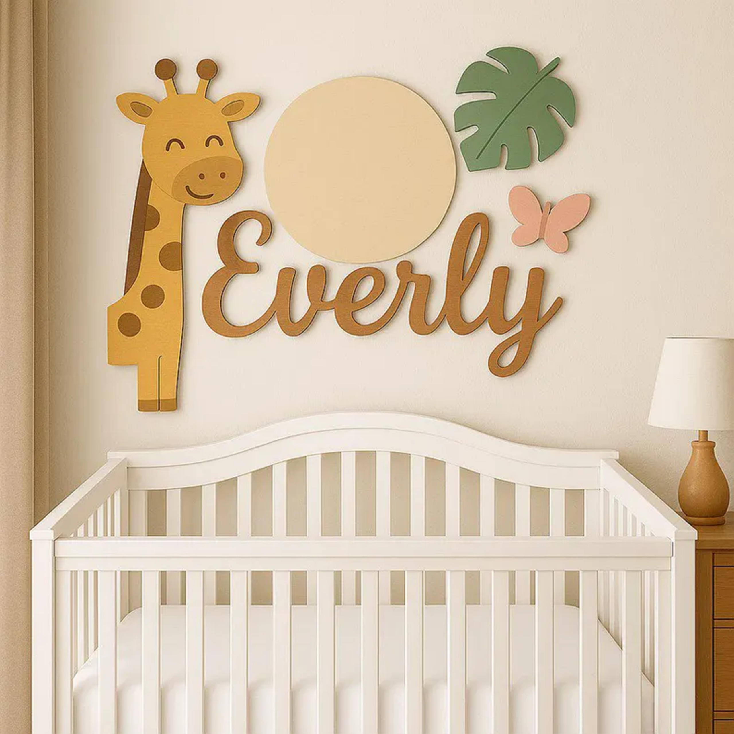 This custom name plaque fits beautifully in safari, jungle, woodland, and neutral nursery themes. Available in multiple size options to suit your space and comes ready to hang for easy installation.