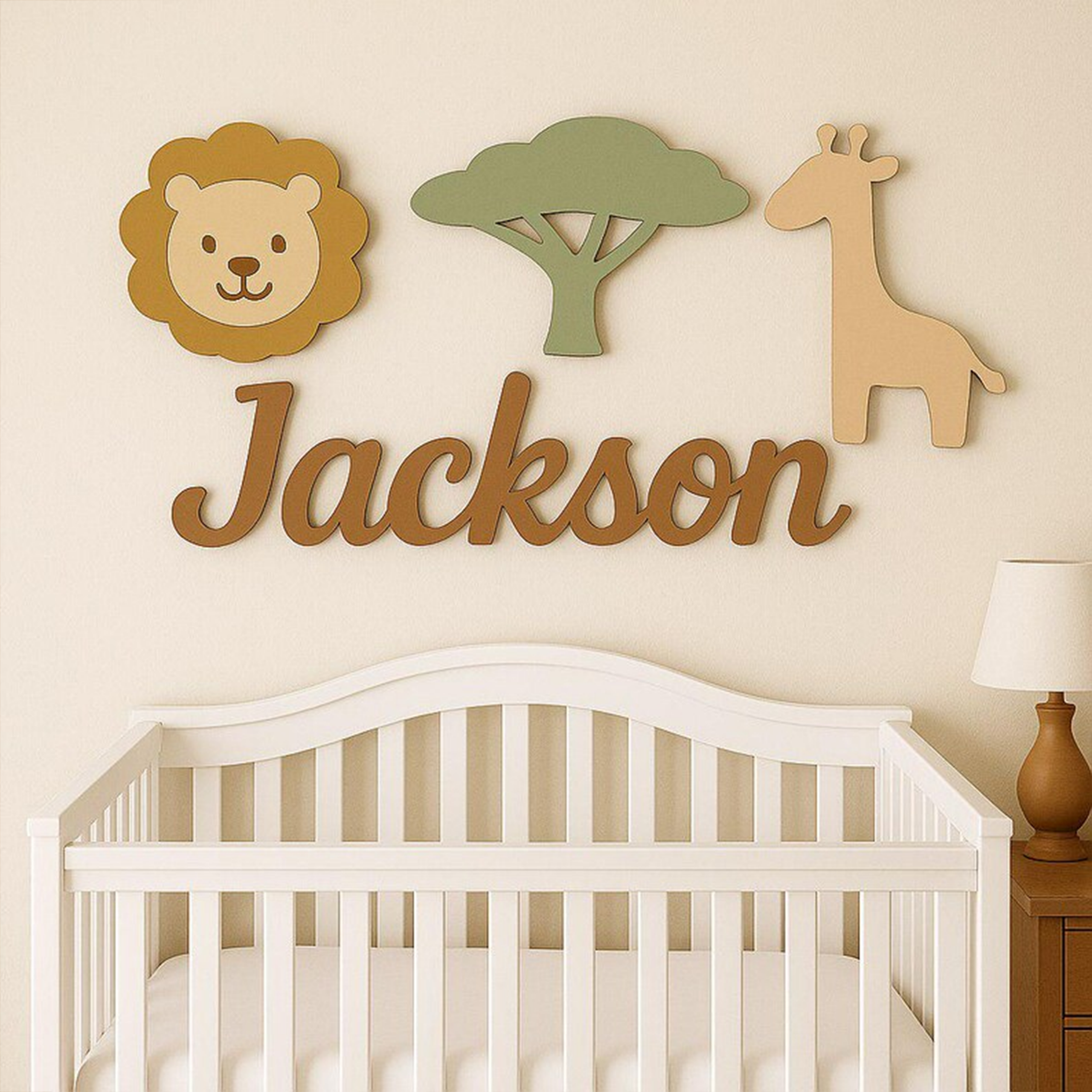 Create a warm and playful atmosphere in your baby’s room with this personalized safari nursery name sign — a charming wooden wall decor designed especially for above the crib.