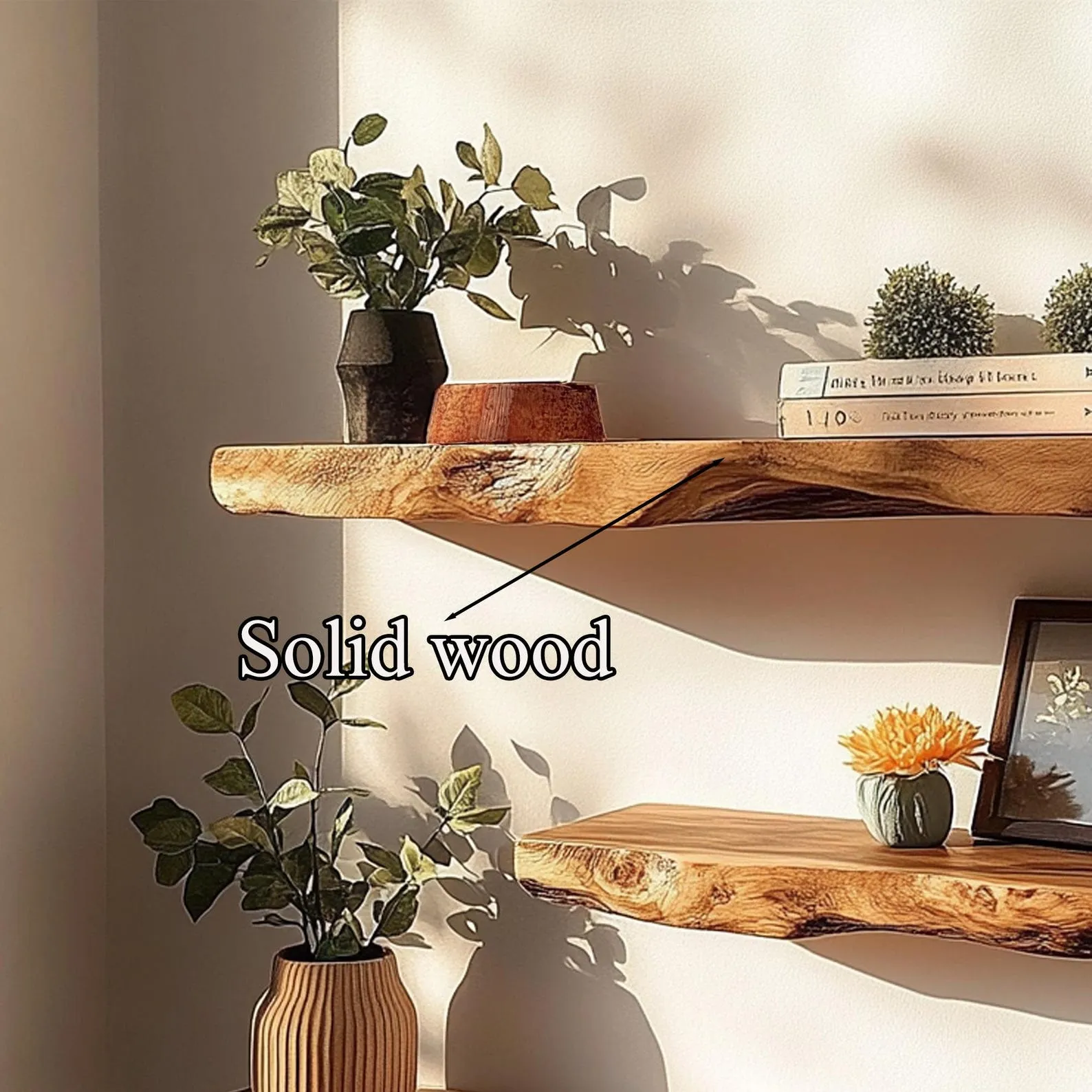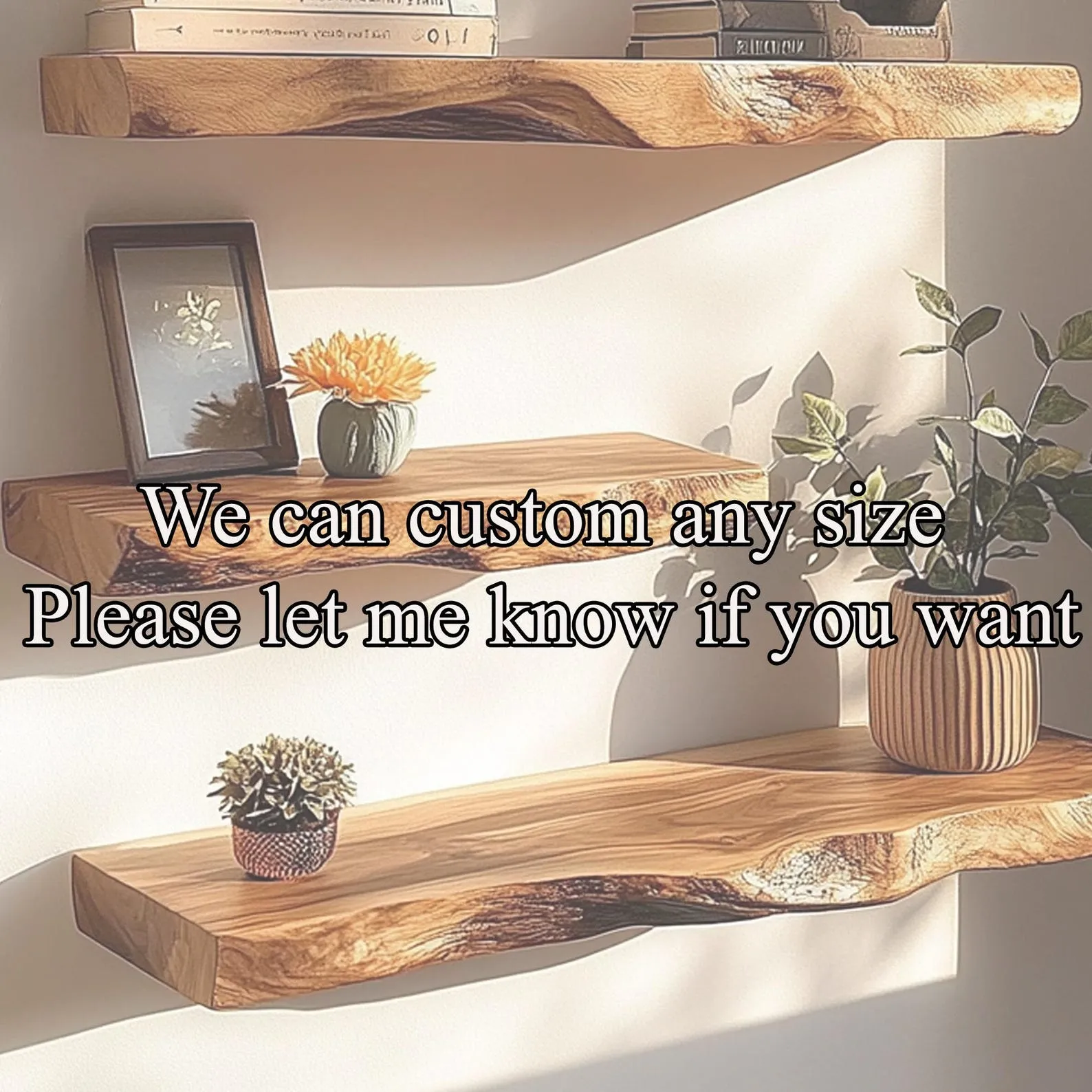 Use the tiers to hold small plants, candles, framed photos or everyday items you like to keep within reach. The floating design keeps the floor open, making the room feel lighter and more spacious. Live edge details and visible knots give the shelves a rustic character suitable for living rooms, bedrooms, bathrooms or entryways.
