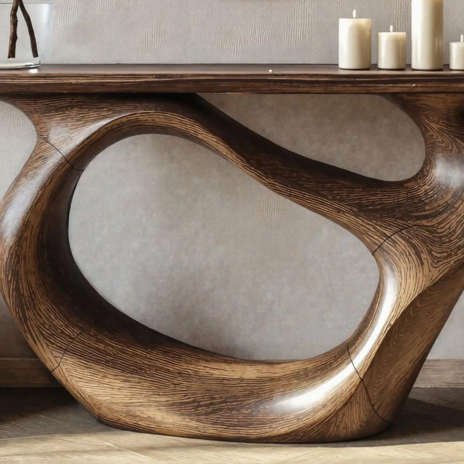This natural solid wood live edge console table offers a narrow profile that fits seamlessly into hallways, behind sofas or along bedroom walls. The tabletop is cut from a single slab of wood so the grain flows continuously from end to end. A gently irregular live edge softens the straight lines and showcases the organic origin of the material.