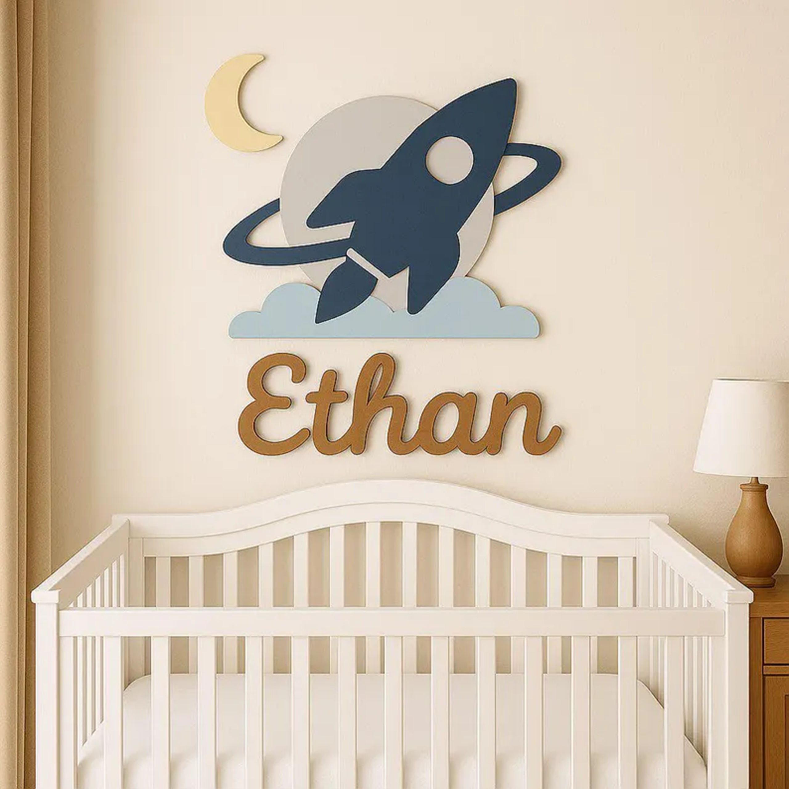 Rocket Ship Name Sign Personalized, 3D Wooden Space Nursery Wall Art, Custom Baby Name Sign Above Crib, Newborn Gift Idea.