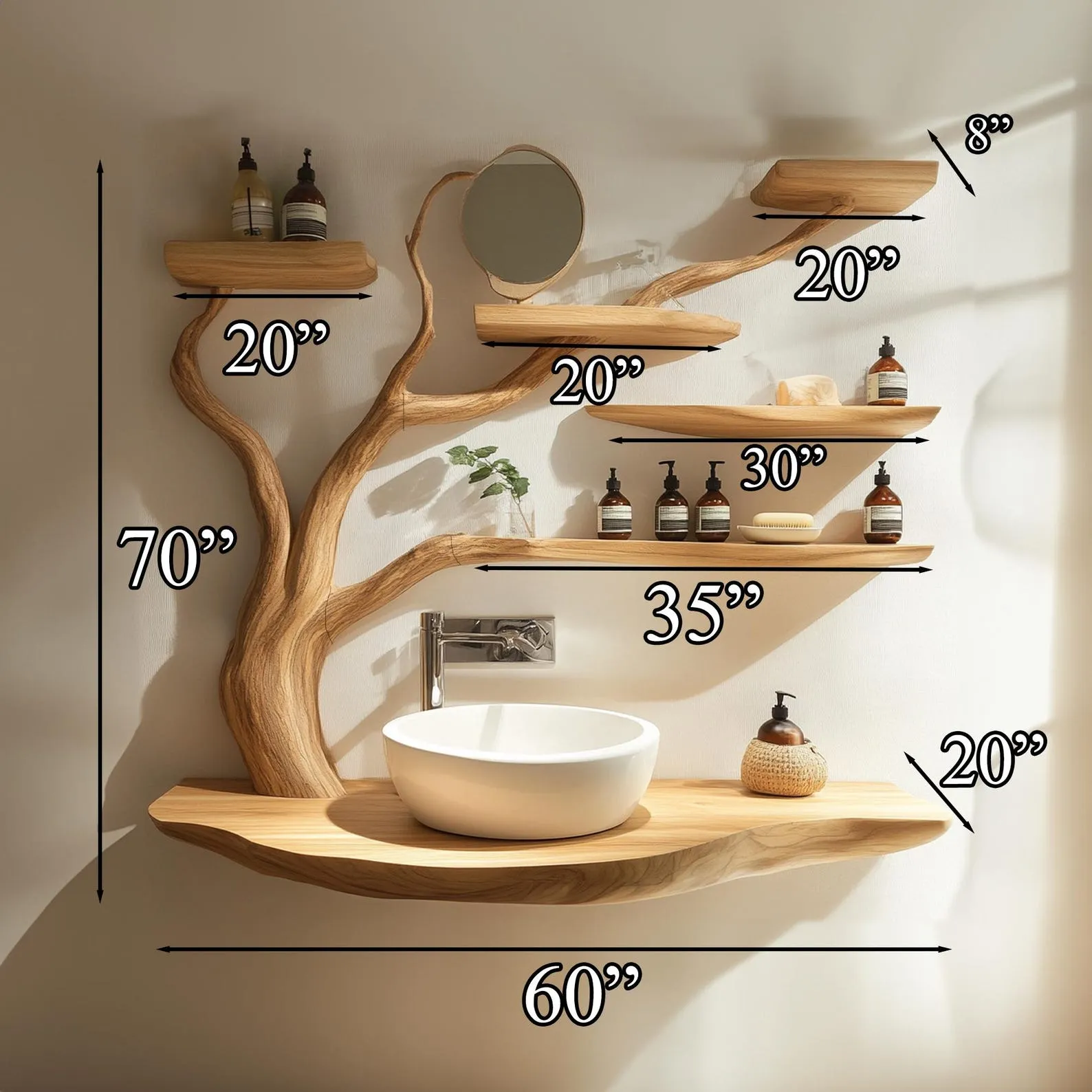 This rustic farmhouse wooden bathroom vanity with sink shelf combines practical storage with handcrafted style. A solid wood frame supports a sturdy top designed to hold a basin, while an open lower shelf provides space for folded towels, baskets or everyday essentials. Live edge details and visible grain give the piece a natural, relaxed character.