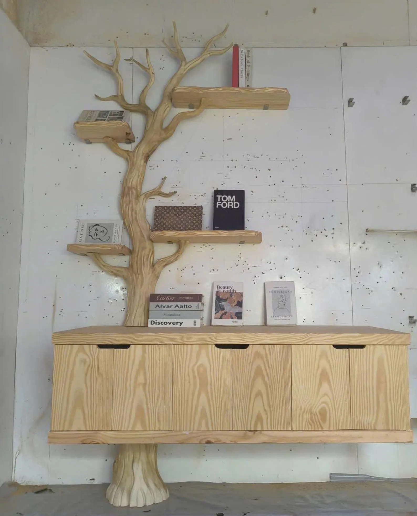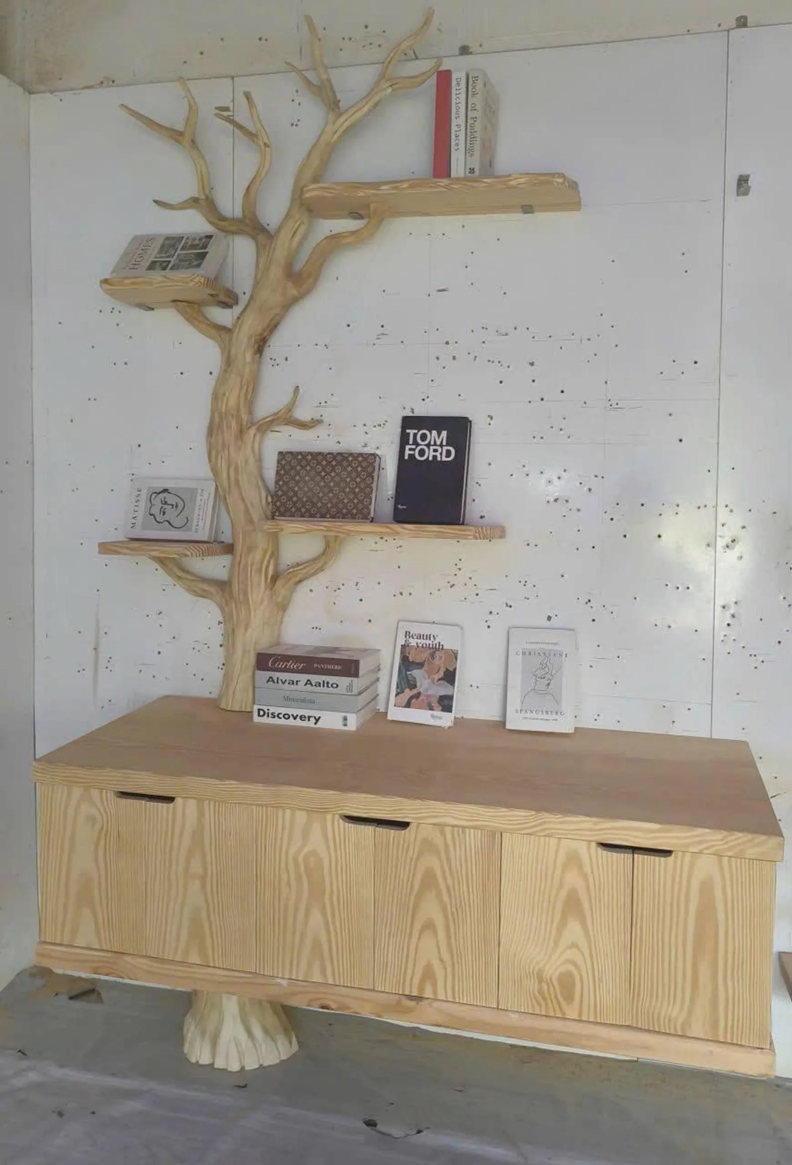 Inspired by vintage washstands, this wooden branch bathroom vanity cabinet brings a sculptural element to small bathrooms and powder rooms. The frame features natural tree like supports combined with a solid top ready for a basin. Below, a compact cabinet or shelf area offers room for toiletries, hand towels and cleaning supplies.
